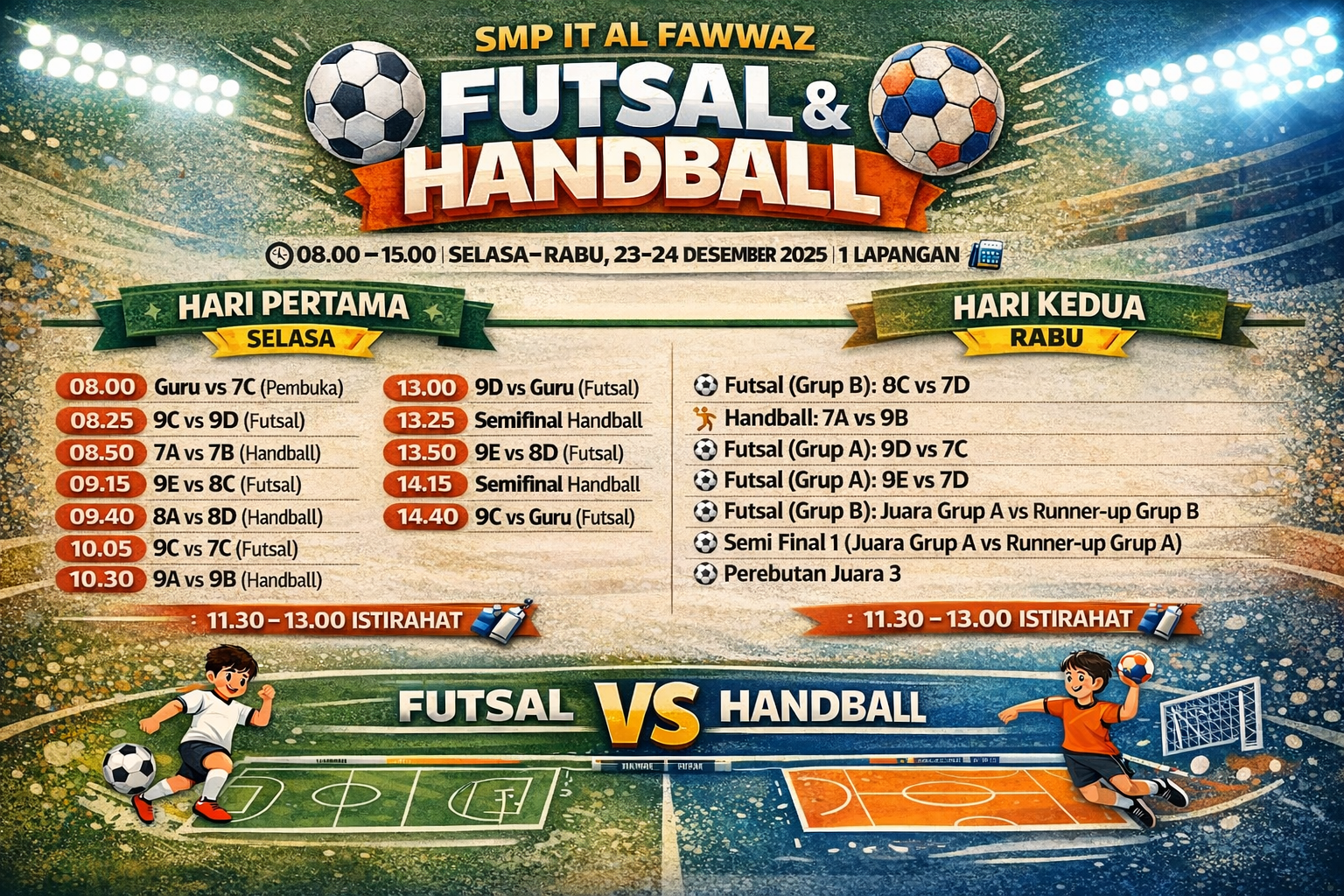 SMP IT Al Fawwaz – Sorak sorai dan semangat sportivitas mewarnai pelaksanaan OSIS Cup 2025 di SMP IT Al Fawwaz yang berlangsung selama dua hari, Selasa–Rabu, 23–24 Desember 2025. Kegiatan ini menjadi salah satu agenda utama Class Meeting akhir semester yang dinantikan oleh seluruh siswa. OSIS Cup menghadirkan dua cabang olahraga, yakni futsal untuk kelas putra dan handball untuk kelas putri, yang diikuti oleh perwakilan kelas dari berbagai jenjang.
